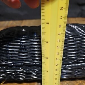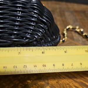 This stylish black woven bag features a chic gold chain, perfect for any occasion. Its elegant design adds a touch of sophistication to your outfit.