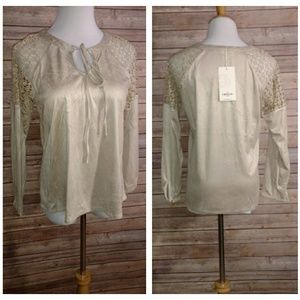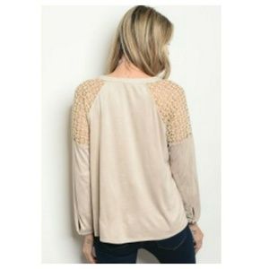 Beige Ivory long sleeve, cold shoulder - Crocheted shoulders, w tie neck. Beautiful & feminine.