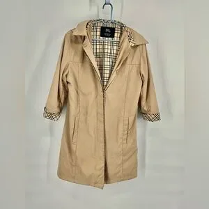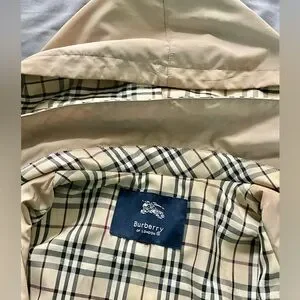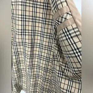 Classic Burberry trench coat. Tan color with iconic check lining. Perfect for any occasion.