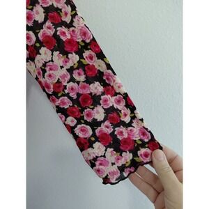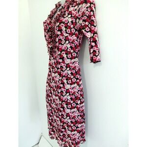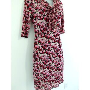 The VTG Y2K 90s Zinc Mesh Dress in XS/S features a pink and red floral pattern, giving it a fairy romantic and stretchy feel. With a V-neckline, 3/4 sleeves, and ruffle accents, this knee-length dress is perfect for various occasions such as parties, formal events, or even business meetings. Made of polyester mesh fabric, this vintage dress from the brand Zinc is lightweight and lined, making it suitable for all seasons. Hand wash only, this dress is sure to add a touch of whimsical charm to your wardrobe.
