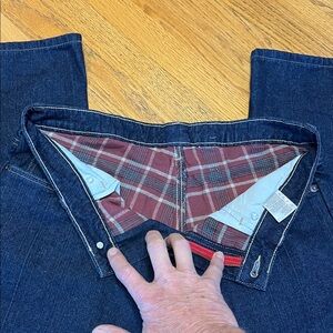 Dickie's Women's Lined Blue Jeans Regular Straight Cut Dark Wash Size 8Regular W/31 L/32. The lying flat waist is 15.5 inches, the rise is 10 inches, and the inseam is 32 inches. They are new with tags and no issues. See photos for condition and your consideration.