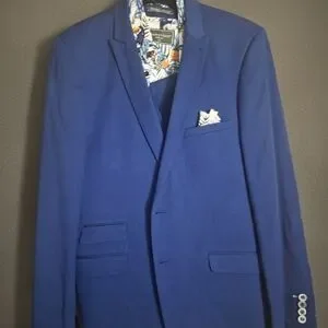 Blue blazer, slacks, and vest featuring vibrant tropical print lining. Includes toucans and pineapples with every purchase!