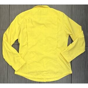The Duluth Trading Women's Coolplus Long Sleeve Snap Button Shirt in size medium is a solid yellow top made from lightweight polyester microfiber. It features a collared neckline, roll tab sleeves, and a snap closure. This breathable and vented shirt is perfect for outdoor activities, with a classic and colorful style that includes pockets for added convenience. The regular fit and machine washable design make it both comfortable and easy to care for, making it a versatile addition to any woman's wardrobe. Pit to pit is 21 inches. Top of shoulder to bottom is 26 inches.
