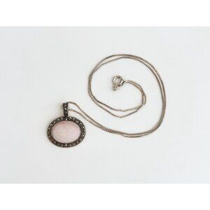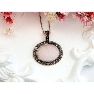 Gorgeous oval sterling silver pink mother of pearl ring. The center stone is bezel set, framed with marcasite stones. The chain itself is a box chain style with a spring ring enclosure. All silver elements are sterling silver and tested positive as such via chemical testing. Very very pretty necklace.