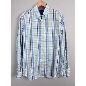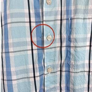Lightweight and easygoing, this Tommy Bahama long-sleeve button‑down features a cool blue plaid in a breathable cotton–silk blend. Finished with a button‑down collar and chest pocket—great for office-to-weekend wear. Note: two faint stains (one near the hemline, one by the button placket); see circled photos.