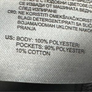 • Fabric: 100 % Polyester (Body); Pockets 90 % Poly / 10 % Cotton