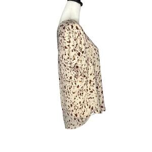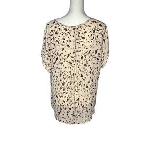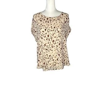 Gently Used in Excellent condition Maurices Short Sleeve Top. Zipper on back in size Medium. Tan, pale pink, Brown, Purple. 100% Polyester.