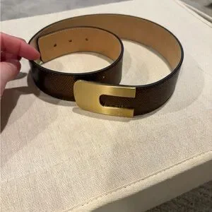 Elegant tan leather belt by Diane Von Furstenberg. Versatile and chic.