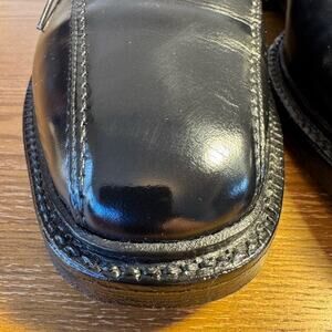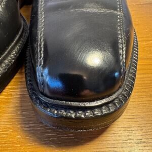 These are “bicycle toe” style derby lace-ups. They are full grain leather, Goodyear welted, and have a double thickness sole,. They easily take a bright shine. They look great dressed up or down. They were made in 2001. They have their original soles and heels. This pair looks to have been almost never worn, a rare find. They are in amazing condition!