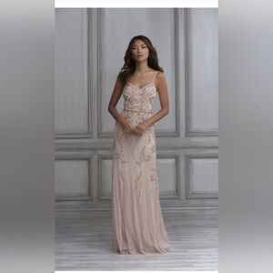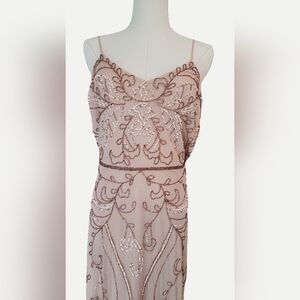 Elegant blush pink dress with intricate embellishments. Spaghetti straps and floor-length design. Perfect for prom.