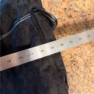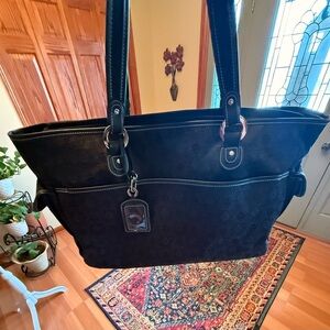 This Anne Klein travel bag is the perfect companion for your next trip. With a spacious interior and various pockets, you can easily organize your belongings. The black fabric exterior features a monogram print and silver tone hardware, giving it a stylish touch. The tote has a zip closure and a shoulder strap handle in black faux leather.
