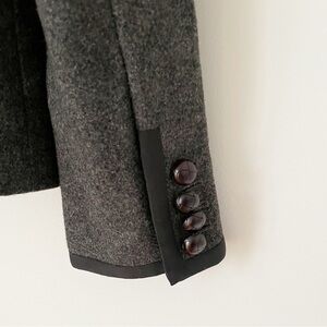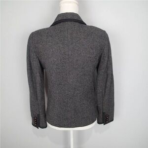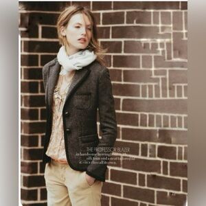 New with tha tags. Never used. No flaws. Vintage from 2000 100% wool Size 10 J Crew the Protessor blazer. Wool grey herringbone. Black silk hem trim, gosgrain trim on pockets. Single chest pocket, with waist pockets. Domed brown buttons. Shell: 100% wool Lining: 100% polyester Has extra button Measured flat Pit to pit/chest 19.5” Sleeves 25” Shoulder to hem 26” Gray Dark Academia Preppy Career W6