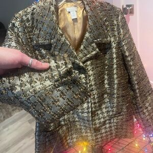 Chico's gold shiny houndstooth tweed cropped blazer.