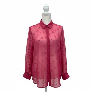 Elevate your classic button-down with this stunning, vibrant raspberry-pink blouse. This top features a delicate clip dot/fil-coupe texture in the shape of scattered hearts, giving it a romantic and whimsical feel