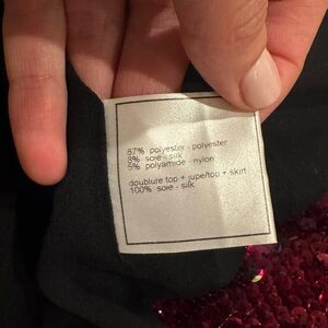 CHANEL SKIRT SET IN BURGUNDY RED SEQUINS. One of a kind style, sexy and eye-catching, great for special events. Under different kinds of light (daylight, sunlight, electric, LED) sequins give different color gamma effect from deep burgundy to fuchsia. Reversed vest is secured by hidden hook at the neckline covered by the button featuring CHANEL CC logo. Maxi skirt is secured by tie-up cord at the waist. See photo for fabric contents. Made in France. Size 38. Pre-loved in good condition with some of the individual sequins missing. They may be easily replaced by professional taylor.