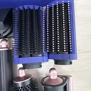 Compact Dyson styling kit with blue and pink accents. Includes multiple attachments for versatile hair styling.