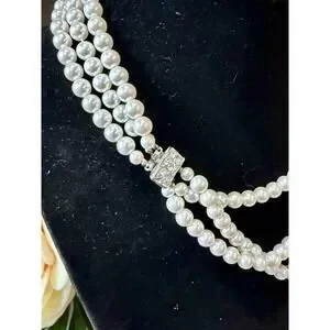 Adorn yourself with timeless elegance in this stunning triple strand faux pearl necklace. Each lustrous pearl gleams under the light, creating a cascade of sophistication that catches every eye. The exquisite crystal-embellished clasp adds a touch of dazzling glamour, securing this piece with a sparkling statement. This necklace promises to elevate your look, adding a refined touch for any special occasion. Perfect for bridal wear, elegant evening events, or adding a touch of vintage charm to your everyday style.