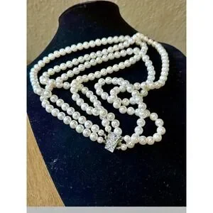 VTG Triple Strand Faux Pearl Necklace Crystal Clasp Bridal Wedding Jewelry
