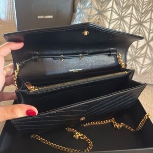 Authentic CLASSIC CASSANDRE CHAIN WALLET IN GRAIN DE POUDRE LEATHER in black. Chain is detachable so can be worn as purse or carried as a clutch.