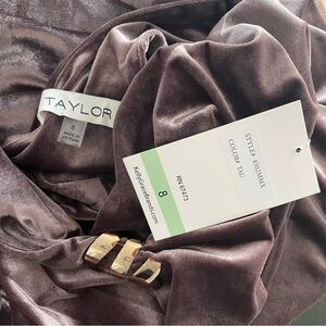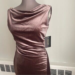 Chic velvet cowl neckline dress with ruched waist. Adorned with gold hardware on shoulder and side zipper. Perfect for elegant occasions. Size 8. Color is taupe. Fabric is not lined.