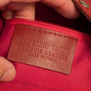 A Maurizio Taiuti red studded leather shoulder bag, an Italian-made accessory known for its quality craftsmanship. The bag features a rich red (sometimes described as maroon or garnet) leather exterior with silver or pewter-toned studs along the strap and possibly the trim.