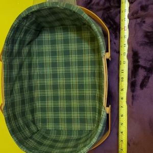 Basket comes with Lid, liner, tie on, large protector inside and a serving tray protector insert. Liner is green and gold.