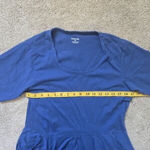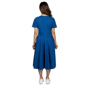This short sleeve dress features a flattering full circle silhouette, scoop neckline, and a stunning blue hue that exudes both sophistication and versatility. Best of all, it has POCKETS! Feel cute and comfortable in 100% organic cotton. Whether you're dressing up for a special event or keeping it casual, this dress is your canvas to create the perfect look!