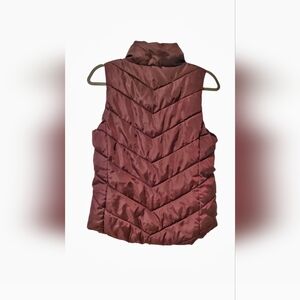 Features a stand collar, full-zip closure, and exterior pockets, and is made of polyester material. Chevron Zip-Up Puffer Vest in a maroon or burgundy color.