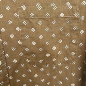 20” armpit to armpit. Extra original buttons attached. Stylish brown shirt with geometric pattern. Ideal for casual outings. Comfortable and trendy.
