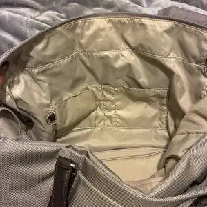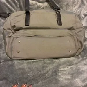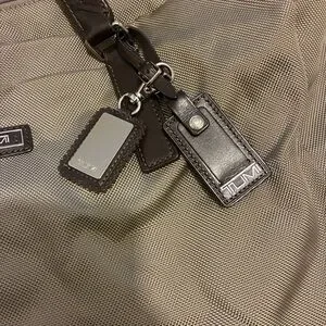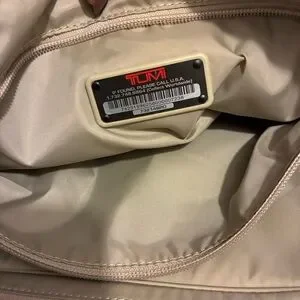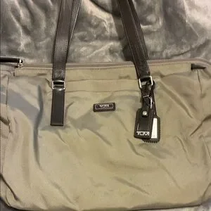 Sophisticated Tumi tote with sleek chocolate leather brown straps. Perfect for everyday use. Stylish and functional. Zippered closure. Multiple pockets inside and outside of the tote. Includes small toiletries bag. Color is Tan and brown. Small spots on front noted in photos. Excellent condition.