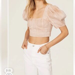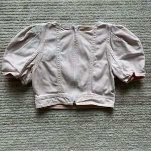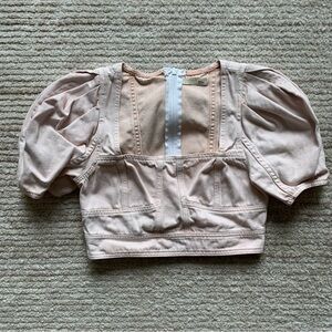 Corset inspired cropped denim top in dusty pink color. Puff sleeves, back zip closure.