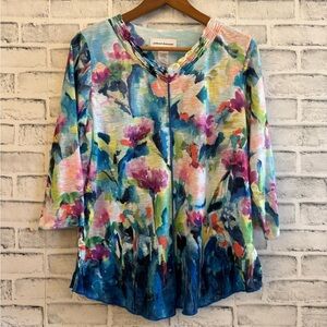 Women’s. Alfred Dunner. Multi color watercolor floral print top. 3/4 sleeves. V-neck. Preowned condition. No stains/tears. Size Small.