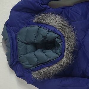 Stylish purple puffer jacket by Columbia. Features a cozy design with zippered pockets. down filled very thick warm. ventilation zippers under arms, detachable hood. ptp 21 sleeve 25 lenght 27