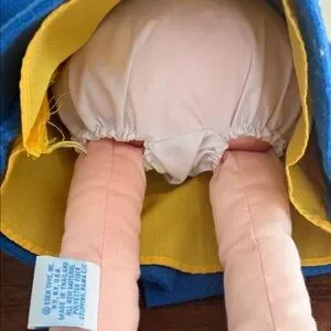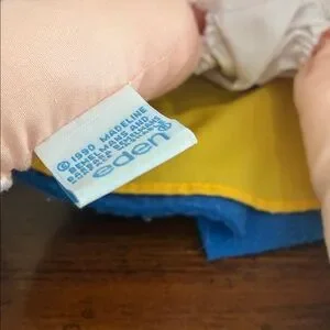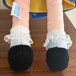 -18” plush doll by Eden; great condition/generalized pilled look on blue coat that might be by design/a little color transfer from the shoes to socks as pictured