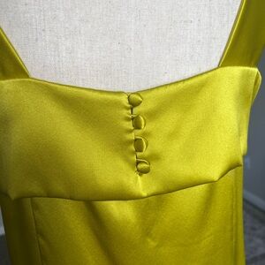 Beautiful Oscar de la Renta Fall 2008 chartreuse silk sleeveless top featuring a structured square neckline, wide straps, and a softly layered bodice detail. The clean, architectural front is balanced by an elegant fabric-covered button-back closure, giving this piece a timeless, couture-inspired feel.