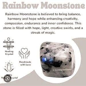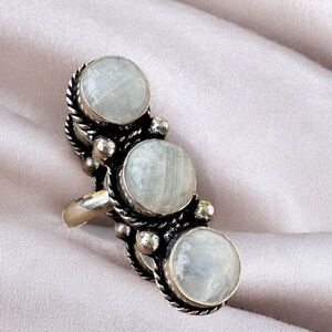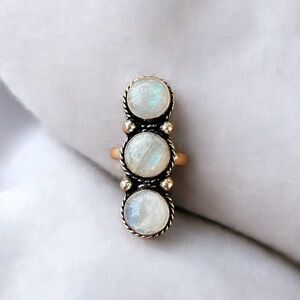 This elegant ring features three stunning white stones set in a silver band. Perfect for adding a touch of sophistication to any outfit. Rainbow moonstone holds feminine energy and the energy of the stars. Walk with your head held high and exude femininity while people turn their heads to look at your statement ring as it catches the light, weather sunlight, candlelight or any light. It lights off with the fire of the universe..