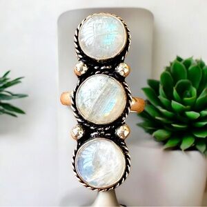 925 Sterling Silver and Triple Natural Rainbow Moonstone Ring