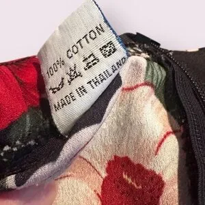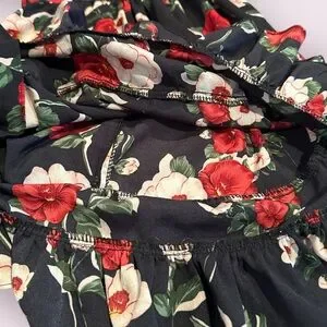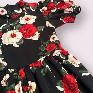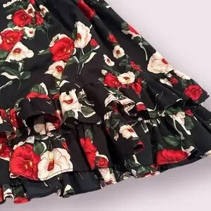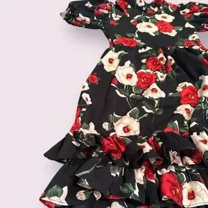 Elegant floral dress featuring ruffle accents. Beautiful red and white flowers on a black base.