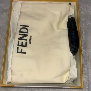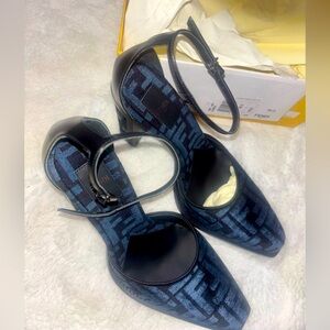 This is NWT FENDI Chenille Jacquard FF Cut Baguette Ankle Strap 105mm Pumps size 39.5 in Black and Blue. These are stylish pumps that feature a squared toe, a 4.25-inch wooden heel with an FF cutout, a branded insole, an FF logo motif, black leather trim, and ankle straps. Serious buys only contact me with any questions. No off Posh mark transactions. No trades. Open to reasonable offers. No Refunds and final Sale! Happy Shopping! Cheers, Luvluxguru