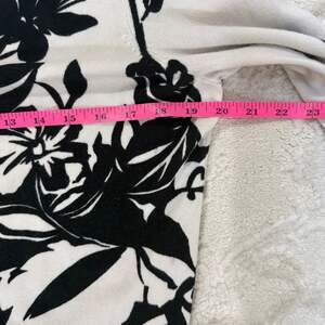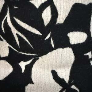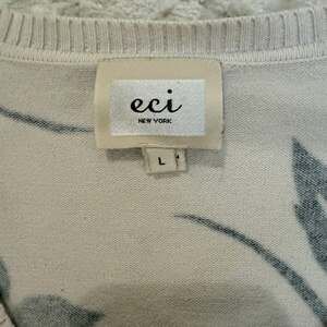 ECI New York women's cardigan sweater featuring a striking black and white jumbo floral abstract print. This button-up v-neck sweater is perfect for adding a chic layer to any outfit. Made from a comfortable blend of 73% Cotton and 27% Nylon. Excellent used condition, no visible flaws. The design is unique and eye-catching, making it a standout piece for your wardrobe.