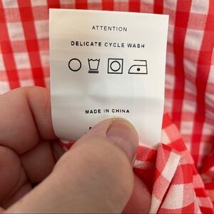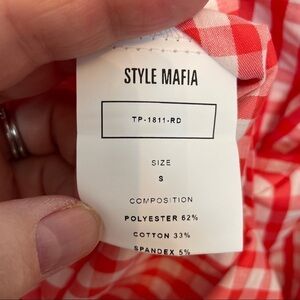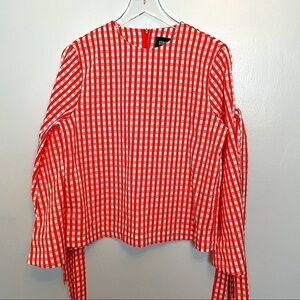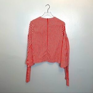 Free People Style Mafia reddish/orange gingham checked top with bell sleeves that tie up to the shoulder. Top is cotton/poly blend with elastine for light stretch. Back zip closure. Cute and unique! Brand new with Free People tag still attached. Perfect condition. Size S.