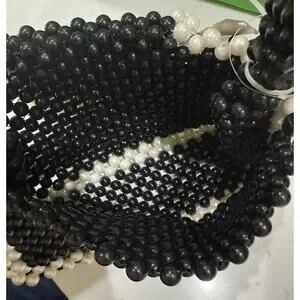 The interior is lined with fabric and has inner pockets for organization. The bag also comes with a detachable strap. The beaded accents add a touch of designer style to this clutch, making it a perfect accessory for any outfit.