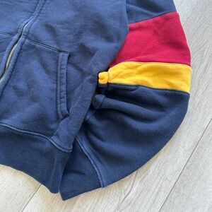 Stylish navy hoodie featuring bold red and yellow accents. Perfect for casual wear.