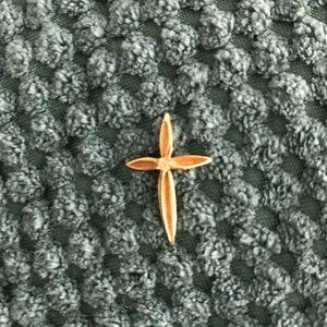 A stylish design on a 14k gold cross with a center diamond. The cross is app 7/8" in length and 5/8" in width. It is a lovely piece that a child could even wear.