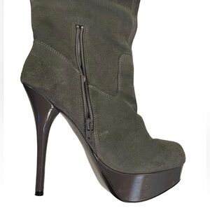 These genuine suede boots are absolutely gorgeous and can be work over the knee, folded over or pushed down for a slouched look. They have a zipper at the back of knee and also at the ankle so they’re easy to get on and off. There’s faux patent leather on the platform and they feature a dramatic, stunning 5” stiletto heel.