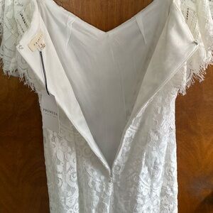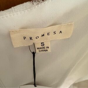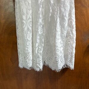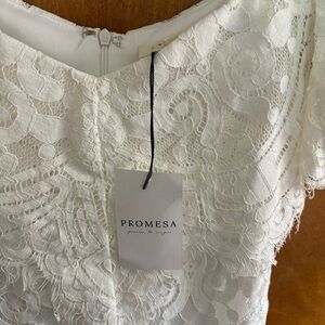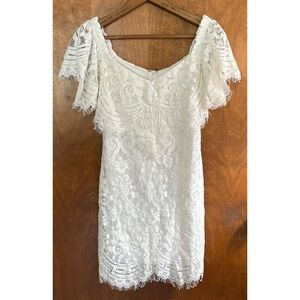 Stunning white off the shoulder Promesa floral lace dress in a size small. It's NWT, new with tags. It features a lace overlay top with elastic sleeves, a full lining, a scallop hem, & back zip closure.