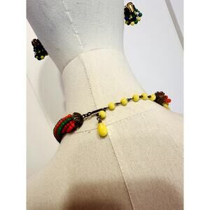 Step into the glamour of the 1930s with this stunning vintage jewelry set. Featuring a bold multi-strand necklace paired with matching clip-on earrings, this set showcases vibrant Japan glass beads in a bright, eye-catching mix of colors. Each bead is beautifully crafted, adding depth, shine, and dimension to the ensemble.