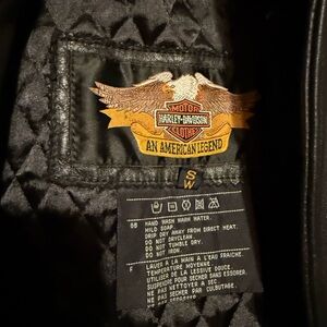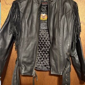 Authentic Harley-Davidson women’s black leather motorcycle jacket featuring classic fringe detailing, heavy genuine leather, and a quilted interior lining for warmth and structure. Great condition. Size S.