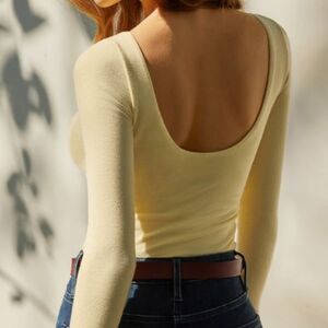 OGL LiteWarm Side Ruched Long Sleeve Open Back Bandless Brami Top In Butter Yellow.