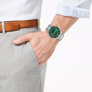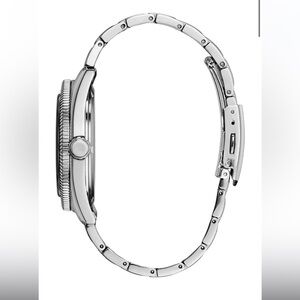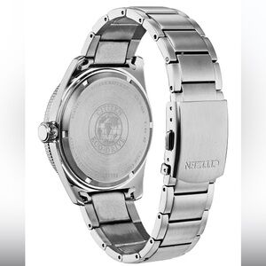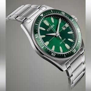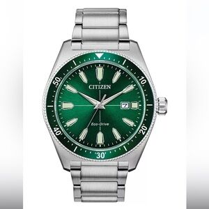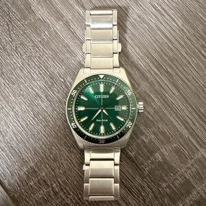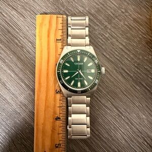 Citizen mens watch with a stainless steel bracelet and green dial. Eco-drive, meaning it is powered by light and never needs a battery. Style #AW1598-70X, currently retailing for $425. Worn a handful of times, please see photos of light scratches on the clasp of the bracelet. Please note that a few links were removed to fit a smaller wrist so be sure to review photos of the measurements.